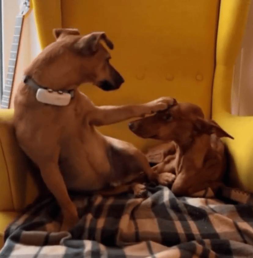 兩只狗狗坐在一起,流浪狗眼神里有著初來者的迷茫和膽怯,過來汪就很溫柔的拍了拍它: