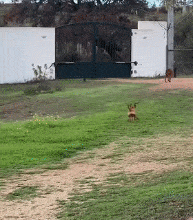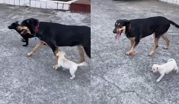 狗狗仿佛也聽懂了主人的囑咐,看到流浪狗就立馬沖了過去,并且很快就把它帶了回來...